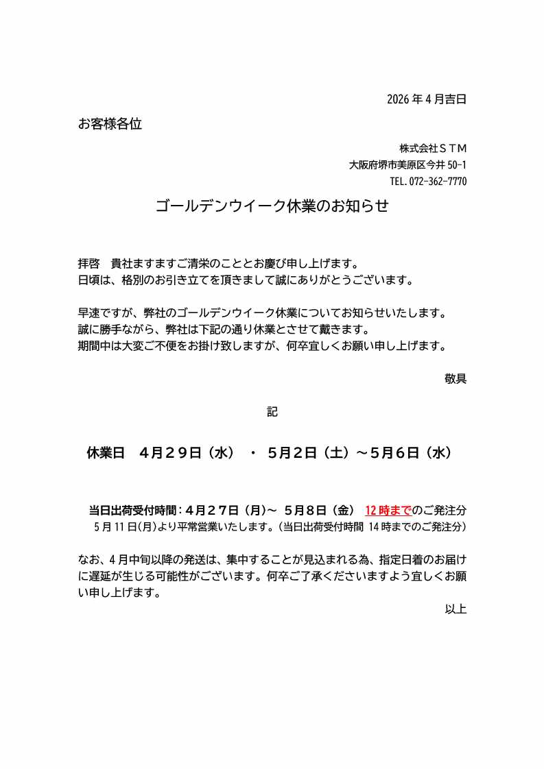 > ゴールデンウイーク休業のお知らせ